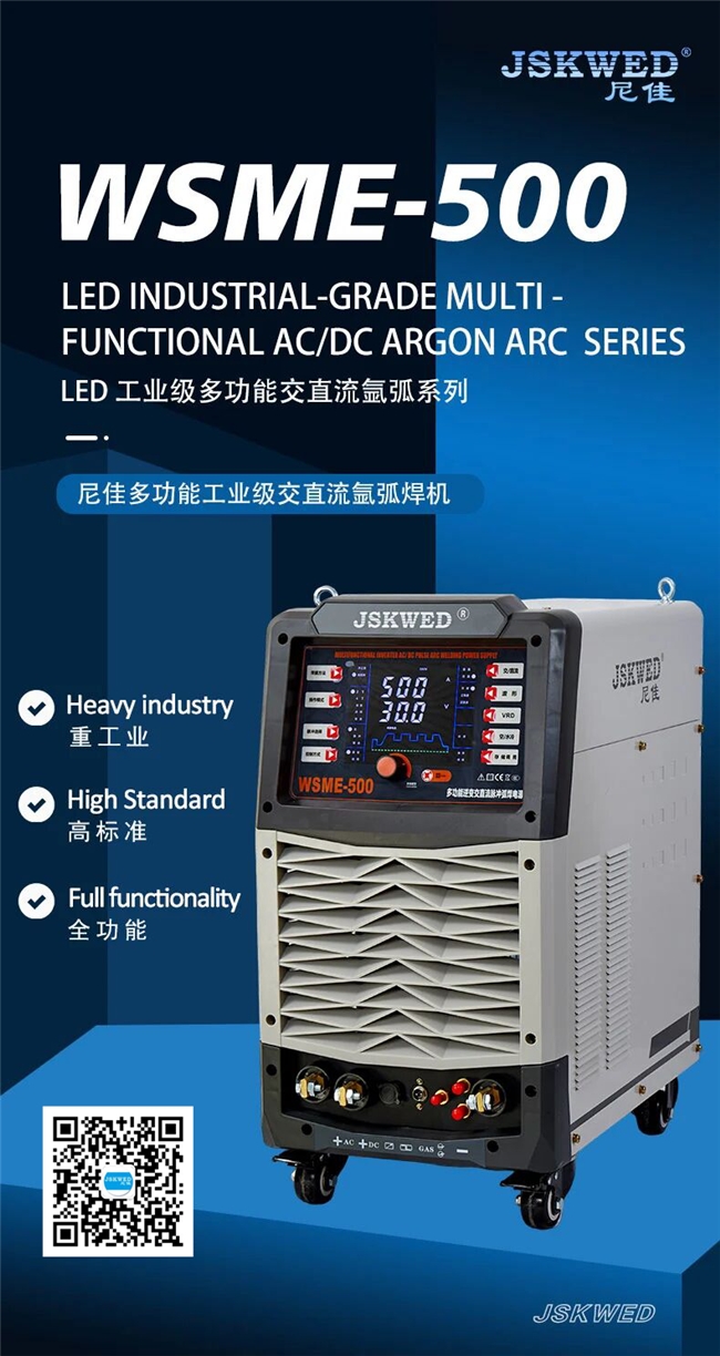 尼佳焊机新品发布,LED工业级多功能交直流氩弧焊机:WSME-500,全新升级,功能更加强悍。全功能焊接模式:交流TIG焊,适用于铝/镁合金焊接;直流TIG焊,适用于不锈钢/铜的焊接;新增冷焊模式,适用于精密修复;等离子切割功能(需定制加配),可切割碳钢,智能起弧,切口光滑。