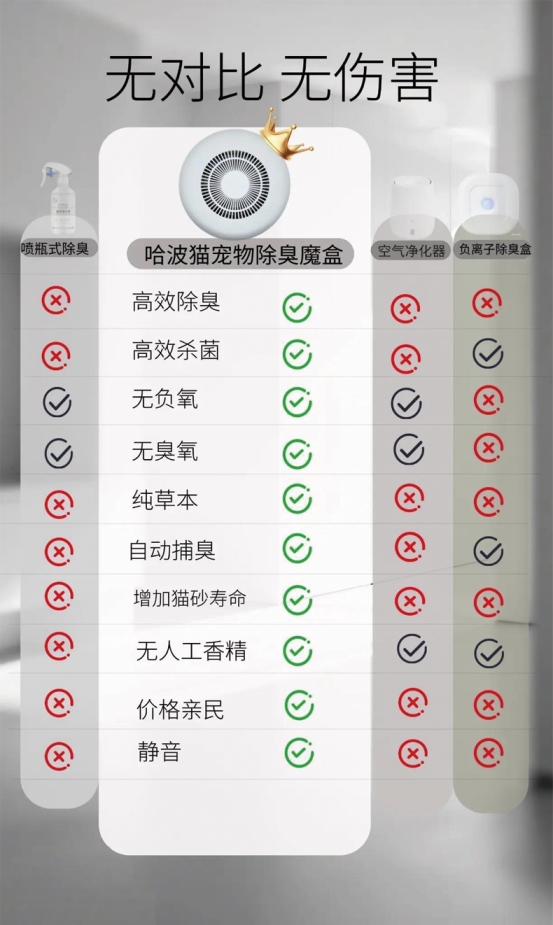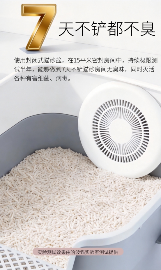 区别于市面上普通的香味压制型除臭产品,哈波猫宠物除臭魔盒采用纯分解式除臭技术,不依赖香味遮盖异味,而是直接捕捉空气中的臭味分子并彻底分解,同时能有效杀灭环境中的细菌病毒,从源头杜绝异味滋生。经极限用户实测,在 15 平方的封闭房间内搭配封闭式猫砂盆使用,实现10 天不铲猫砂房间无滂臭,更有用户持续 7 个月仅添砂不换砂,彻底打破传统养宠的清洁痛点。